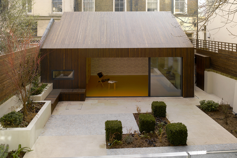 The new house is characterised by bronze paneling, frameless glazing and fastidious detailing which results in jewel-like bookend to the terrace.