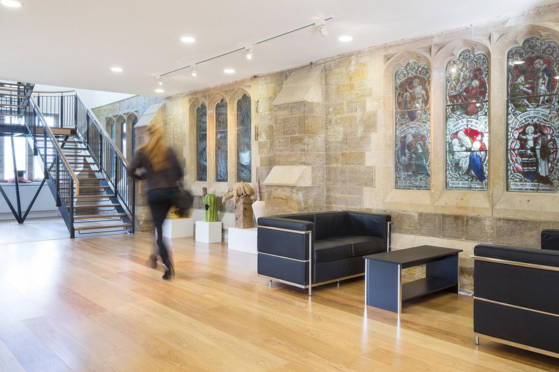 The scheme rationalises the existing circulation with a new free-standing staircase and reveals previously hidden stained glass windows.